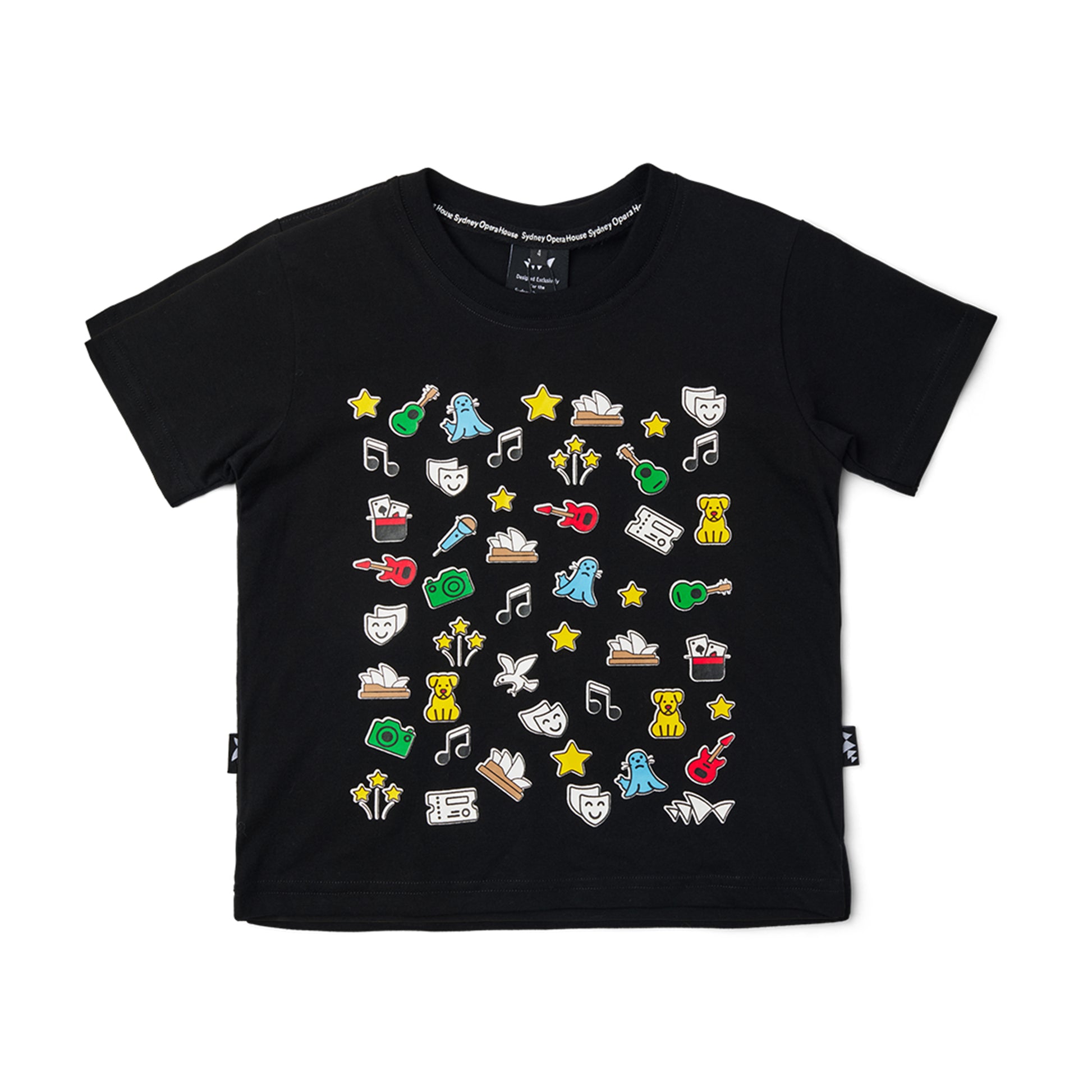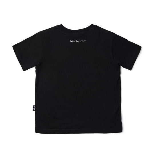A relaxed, comfortable kids tee in black with cute Opera House characters.