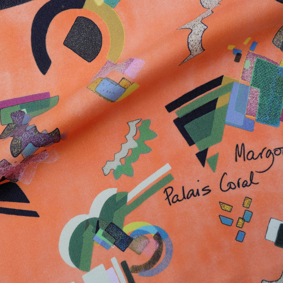 This Palais Jacaranda silk scarf in coral is designed and made in Australia by Margot Design. With a hand rolled finish design, the scarf can be tired around the neck, at the waist or worn as a headscarf.