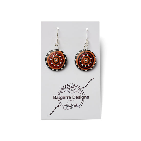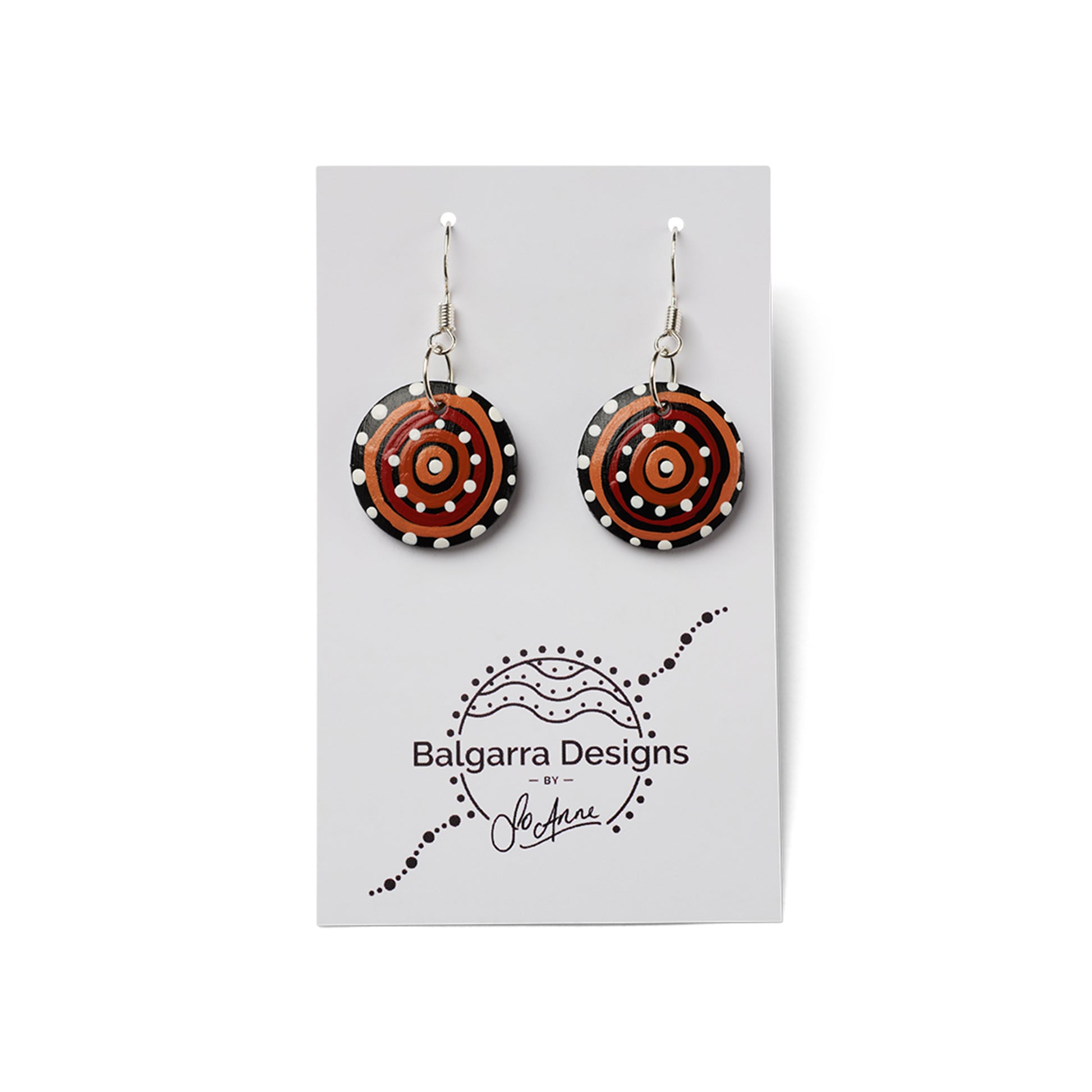 The Campsite small wooden earrings are individually designed and hand painted before being finished with gloss and stirling silver hooks.