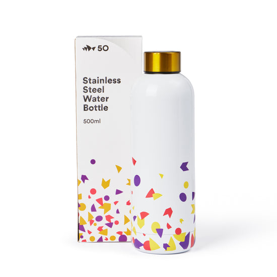 Help us create a more sustainable future with this 500mL stainless steel water bottle featuring a fun, colourful design in celebration of our 50th anniversary.