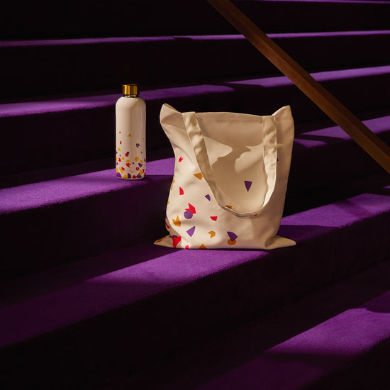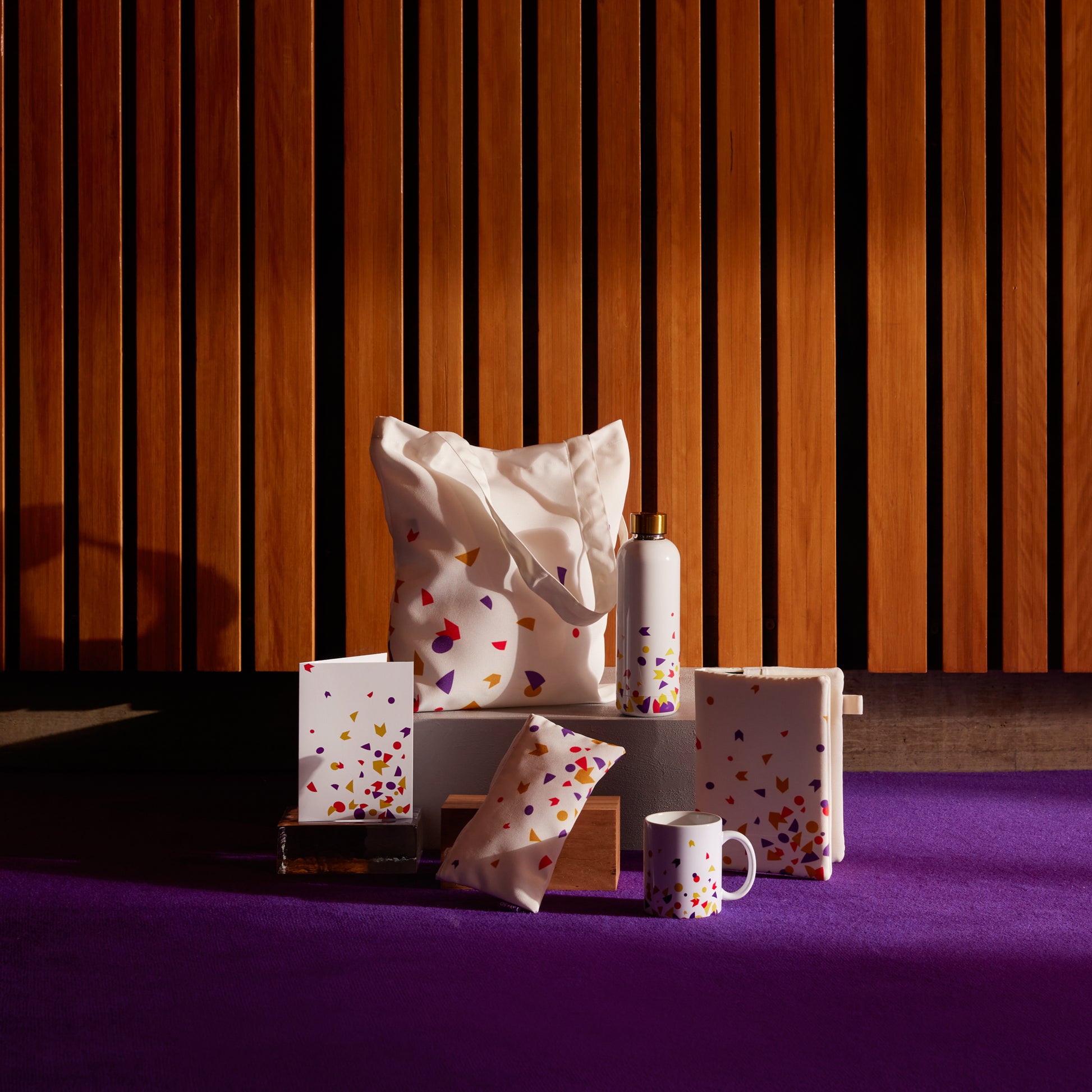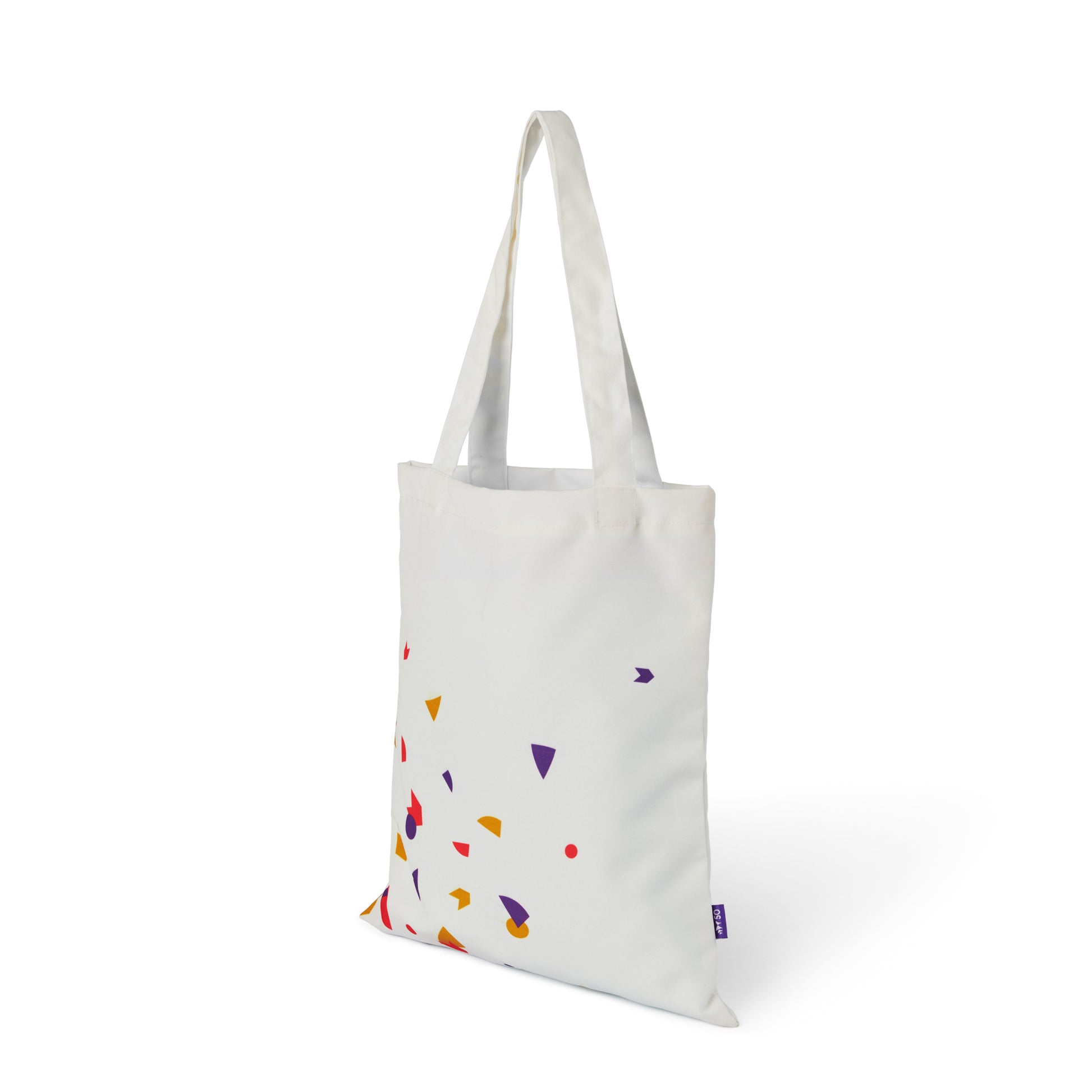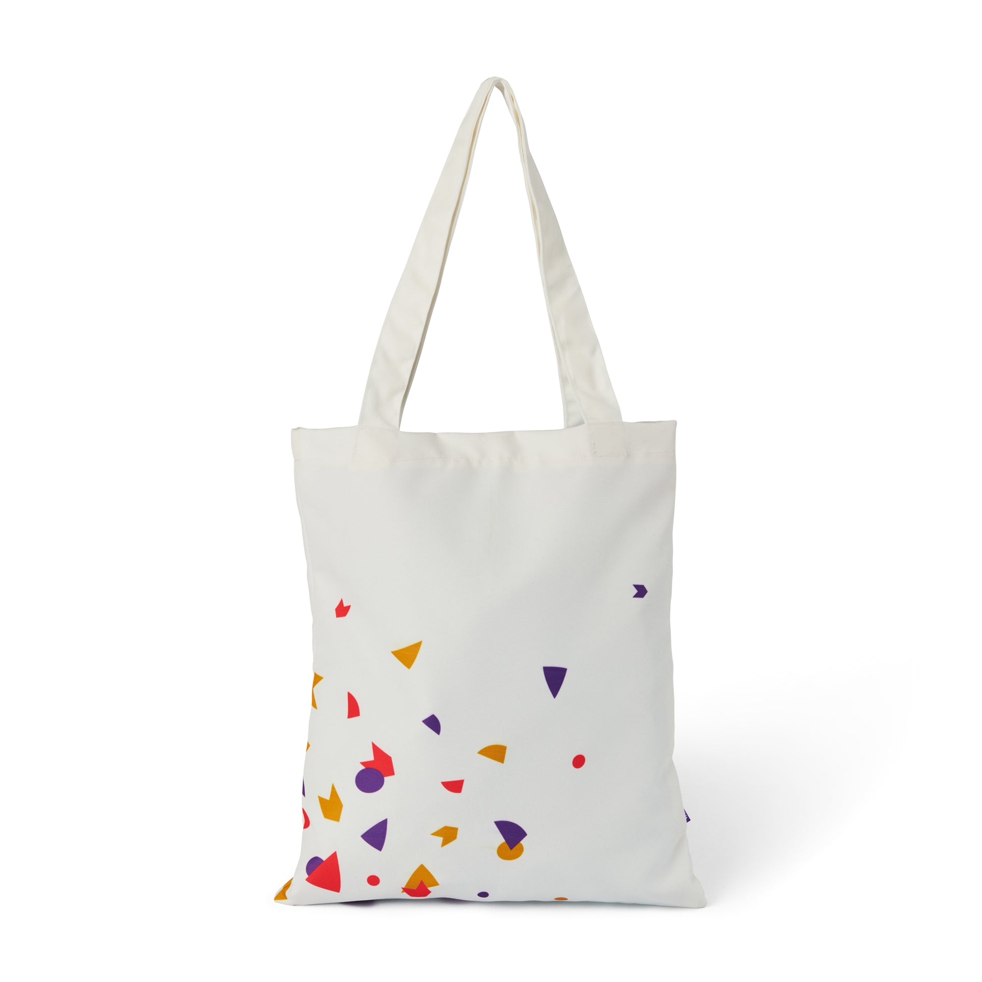 The Sydney Opera House 50th Anniversary Celebration Tote bag. The confetti style artwork is created using shapes found at the Opera House and uses the colours of the Joan Sutherland and Concert Hall carpets alongside gold to celebrate 50 years of the Opera House. The bags long straps makes it easy to carry on your shoulder. It has a spill proof internal lining and pocket.
