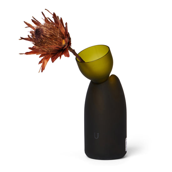The Upcycled Trio vase is handmade and versatile, offering multiple ways to display your flowers. Each piece is unique, crafted from upcycled glass and made with sustainable materials and practices. Perfect for adding a personal touch to any space.